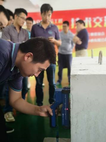 現(xiàn)場(chǎng)技術(shù)交流環(huán)節(jié),活動(dòng)主辦方準(zhǔn)備了標(biāo)準(zhǔn)鋼筋混凝土構(gòu)件,與會(huì)技術(shù)人員使用自帶的鋼筋保護(hù)層厚度檢測(cè)儀進(jìn)行檢測(cè),通過(guò)結(jié)果比對(duì),尋差距、找問(wèn)題,共同探討交流平時(shí)檢測(cè)工作中遇到的疑難點(diǎn)。