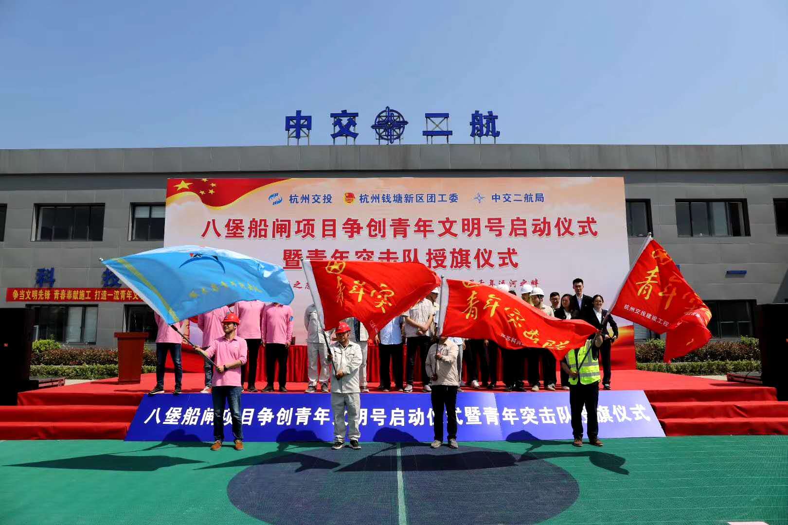 2020年4月29年日上午,八堡船閘項(xiàng)目爭(zhēng)創(chuàng)青年文明號(hào)啟動(dòng)儀式暨青年突擊隊(duì)授旗儀式在杭州八堡船閘項(xiàng)目部正式舉行,公司啄木鳥(niǎo)青年突擊隊(duì)參與組建八堡船閘項(xiàng)目青年突擊隊(duì)。本次活動(dòng)邀請(qǐng)到了錢塘新區(qū)團(tuán)工委副書記金靈華,杭州交投集團(tuán)團(tuán)工委副書記、船閘管理公司總經(jīng)理江玲以及建設(shè)管理集團(tuán)副總經(jīng)理、八堡船閘工程建設(shè)處處長(zhǎng)潘國(guó)華等相關(guān)領(lǐng)導(dǎo)。