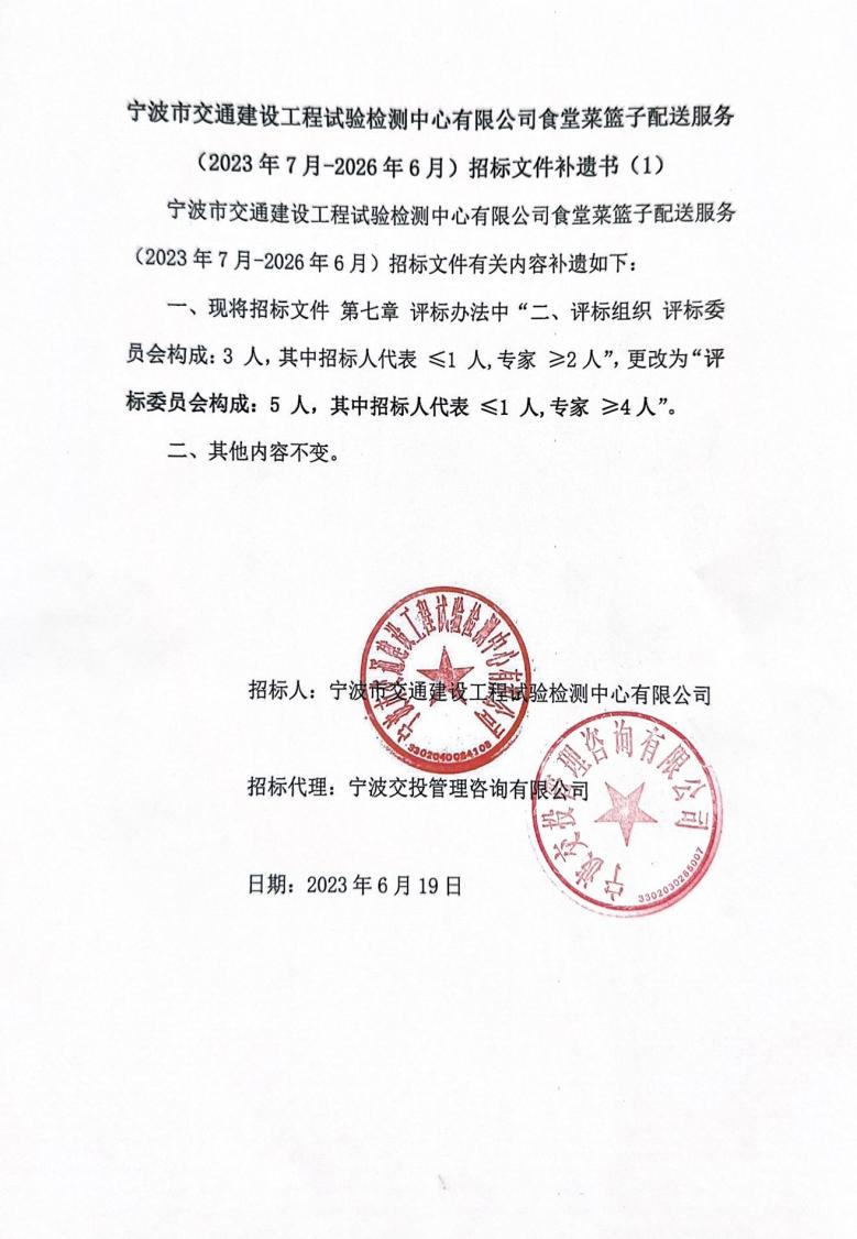 寧波市交通建設工程試驗檢測中心有限公司食堂菜籃子配送服務(2023年7月-2026年6月)招標文件補遺書(1)