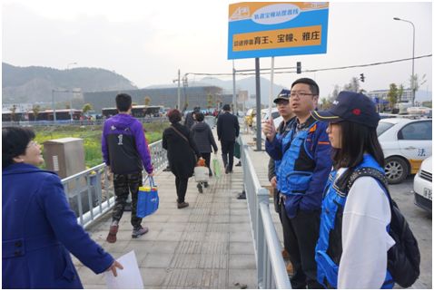 清明小長假期間,我公司每天都有三名“千人交通志愿團”的志愿者在軌道寶幢站志愿服務。五點四十八分,隨著首班軌道列車緩緩駛?cè)雽毚闭?,早已準備就緒的工作人員以及一群群身著馬甲的志愿者們便開始了他們一天忙碌的工作。